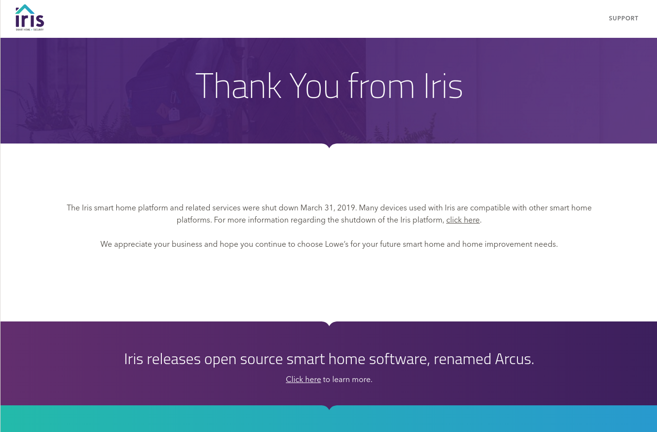 Arcus Smart Home is the continuation of Lowe's Home Automation and Security system, known as IRIS by Lowes. Arcus started as part of Lowe's efforts to rewrite IRIS, which was originally developed by AlertMe. This version, often reffered to as "IRIS Version 2" was based a completely different platform, using modern service oriented architecture with JVM based services on a shared message bus. In 2019, Lowe's announced that they would be exiting the smart home market, and would be releasing IRIS as open source, with some exeptions. Users were offered credit for equipment that did not work on other platforms, such as the well-known Samsung SmartThings. On April 1st, 2019 IRIS was officially shut down.